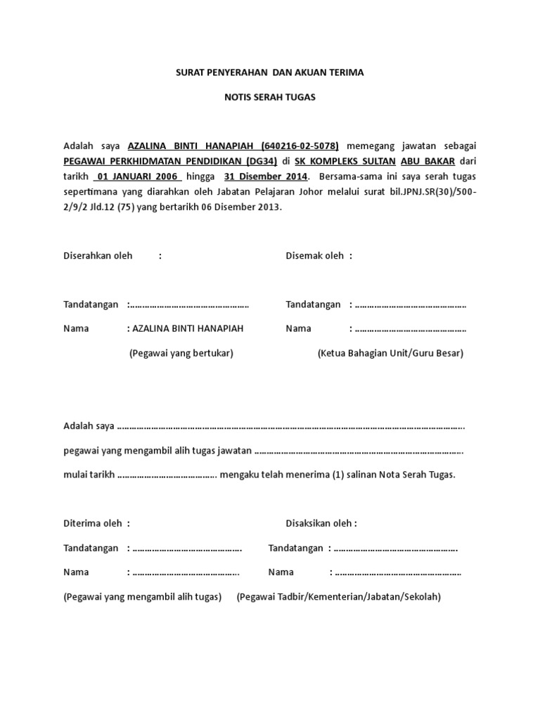 Contoh surat serah tugas. Surat Penyerahan dan Akaun Terima Nota Serah Tugas. Lain-lain Hal SURAT PENYERAHAN DAN AKUAN TERIMA.