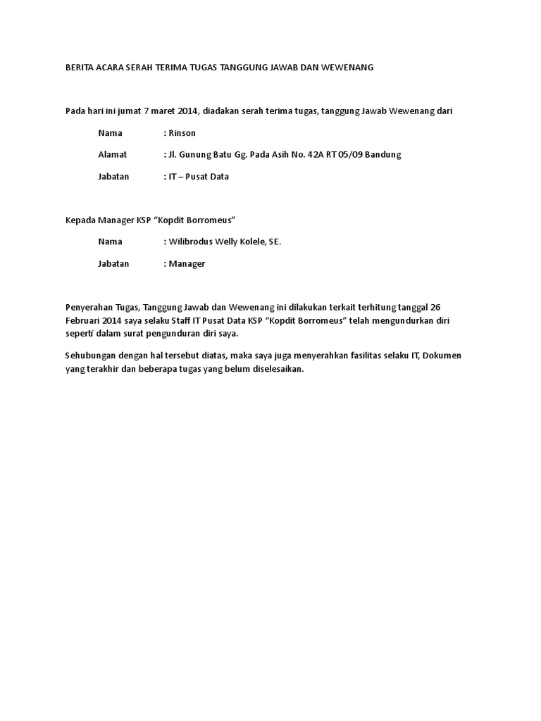 Berita Acara Serah Terima Tugas Tanggung Jawab Dan Wewenang Pdf