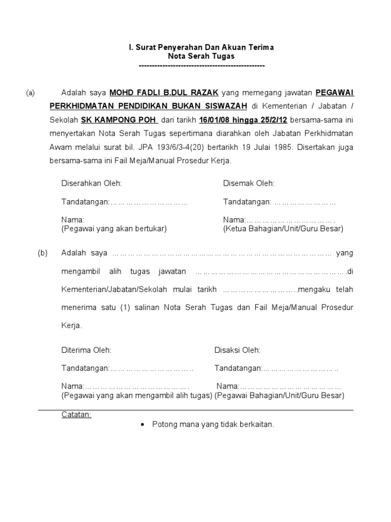 Disertakan juga bersamasama ini Fail Meja Manual Prosedur Kerja. View flipping ebook version of SURAT PENYERAHAN DAN AKUAN TERIMA NOTA SERAH TUGAS published by g-98267459 on 2020-12-31. JPA19363-420 bertarikh 19 Julai 1985.